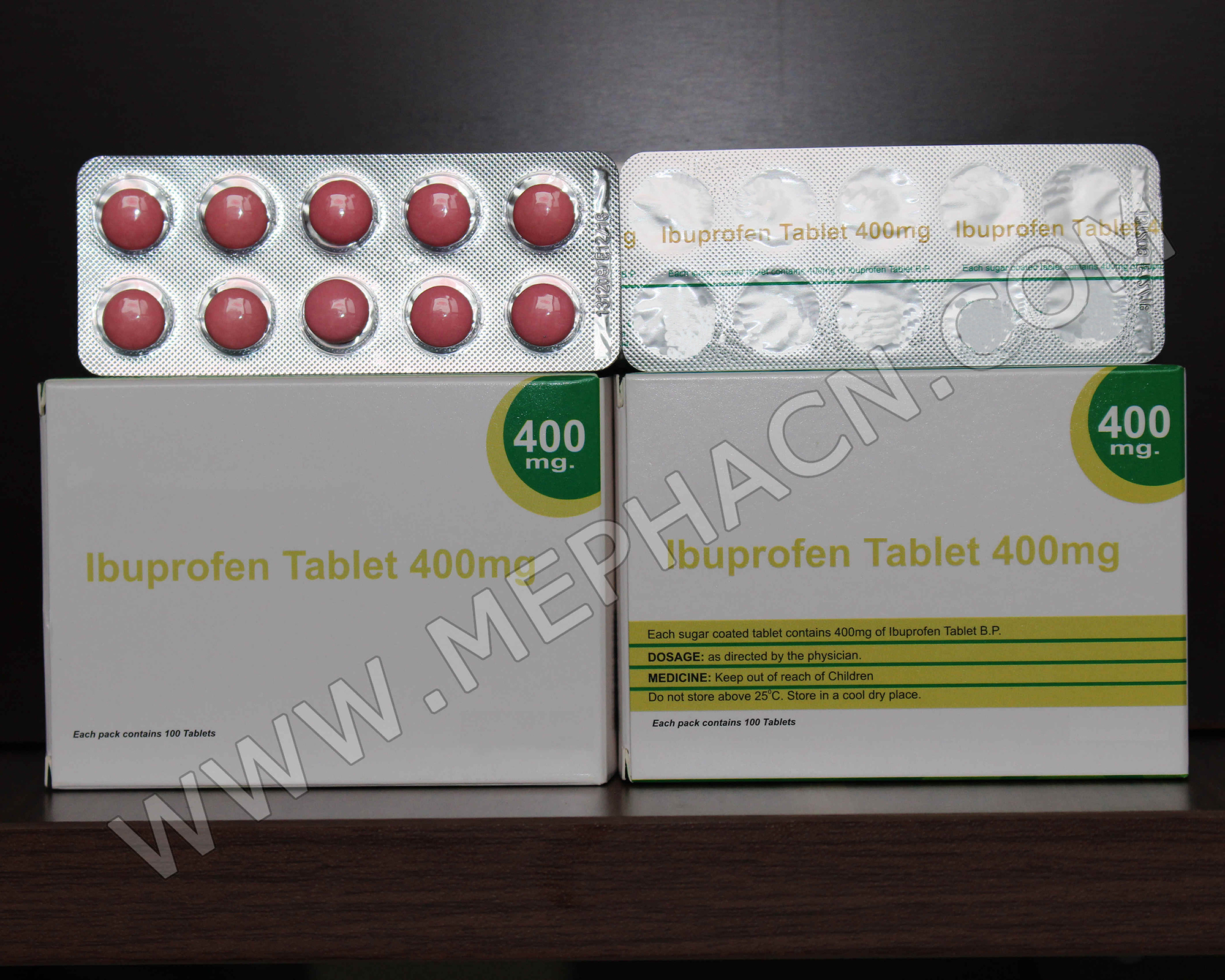 1. Product name: Ibuprofen tablet 2. Specification: 400mg 3. Package: 10 tablets/blister, 10 blisters/box 4. Shelf life: 36 months 5. Registration dossiers are available. If you are interested in our products,ple feel free to contact us.